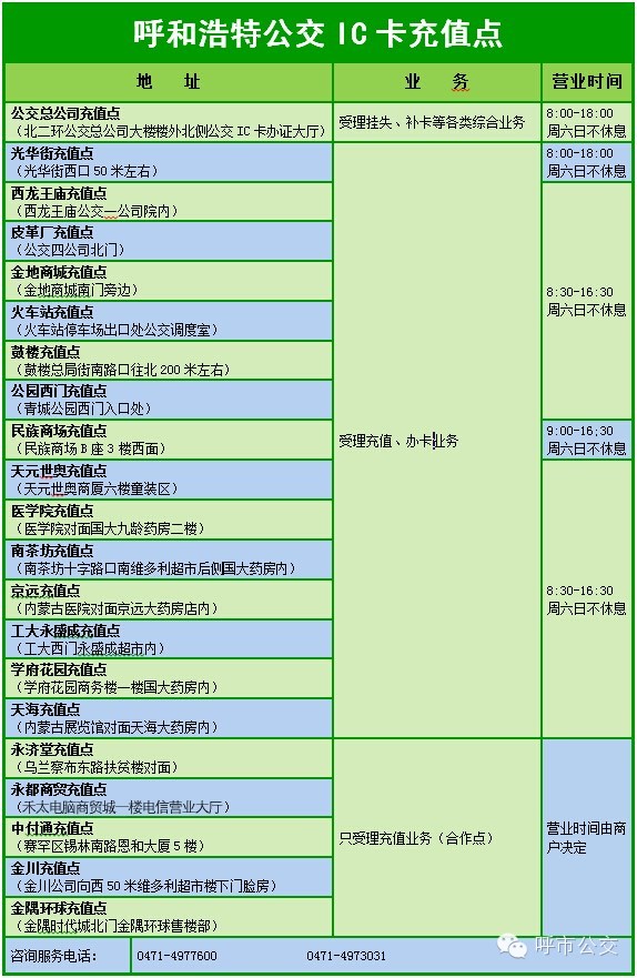 根据有关规定,清明节期间,呼和浩特市公交IC卡业务点工作时间有调整:所有充值点、综合业务点(挂失、退卡、补卡)4月5日休息,4月6日正式上班。请大家提前充值,以免影响您的出行。