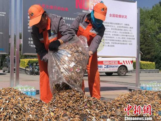 31日上午,在呼和浩特市苏雅拉广场的世界无烟日活动现场,环卫工人们不断将他们捡拾的烟头运来,这些烟头迅速堆成了一座“小山”,并散发出刺鼻的烟熏味。