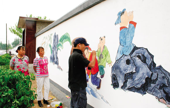 7月13日,元宝山区平庄镇前进村文化墙正在绘制中。目前,赤峰市1156个嘎查村和51个农牧林场分场的“十个全覆盖”工程已完成投资30.95亿元。本报记者徐永升摄