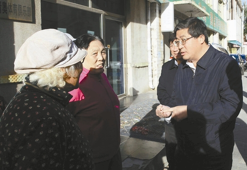 市委书记罗永纲在体委小区,听取群众的意见和建议。记者 邵楠 摄